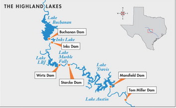 Let me set the stage regarding the Highland Lakes, a chain of lakes northwest of Austin. From north to south, they are Lake Buchanan, Inks Lake, Lake LBJ, Lake Marble Falls, Lake Travis and Lake Austin.