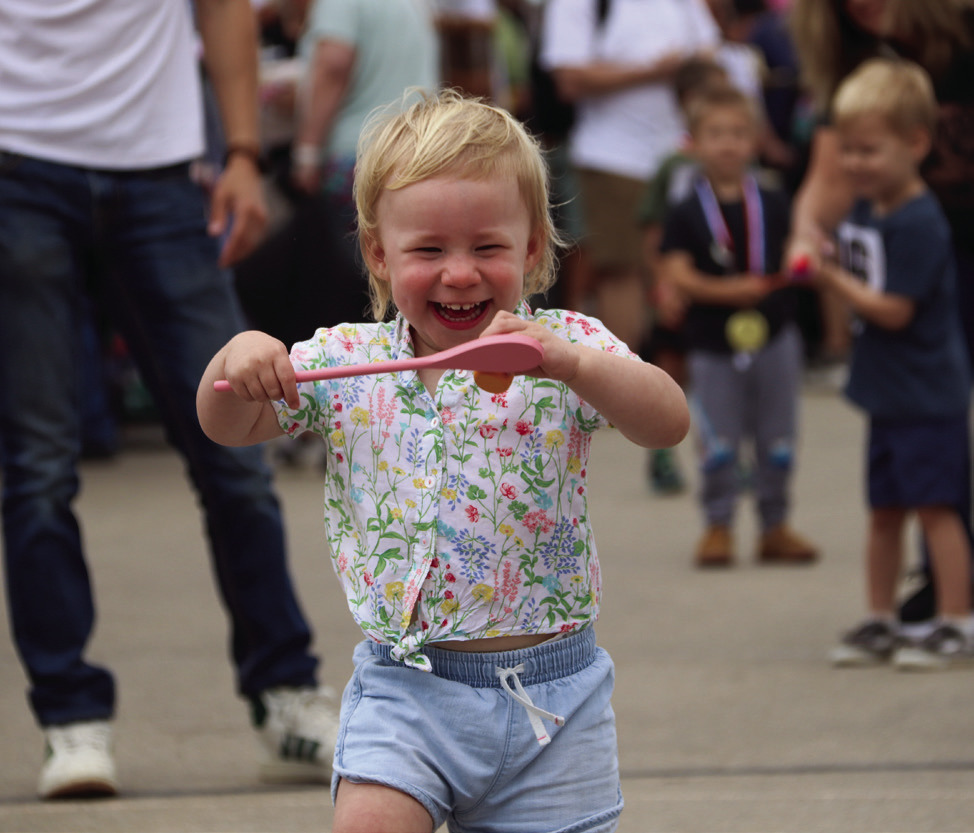 As the morning continued, Main Street shifted from race course to playground. Children lined up by age group for sprints, egg and spoon races, and sack races, with chalked start lines stretching across the pavement and a finish line set near the Main Stage.